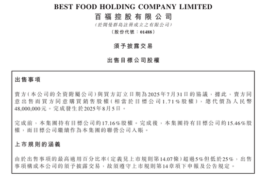 百福控股8月6日发布公告恒信期货,公司的全资附属公司奇昕控股有限公司,以4800万元对价转让遇见小面1.71%的股权。在股权转让完成后,上市公司持有遇见小面的股权比例从17.16%下降到15.46%,而遇见小面将继续作为公司的联营公司入账。