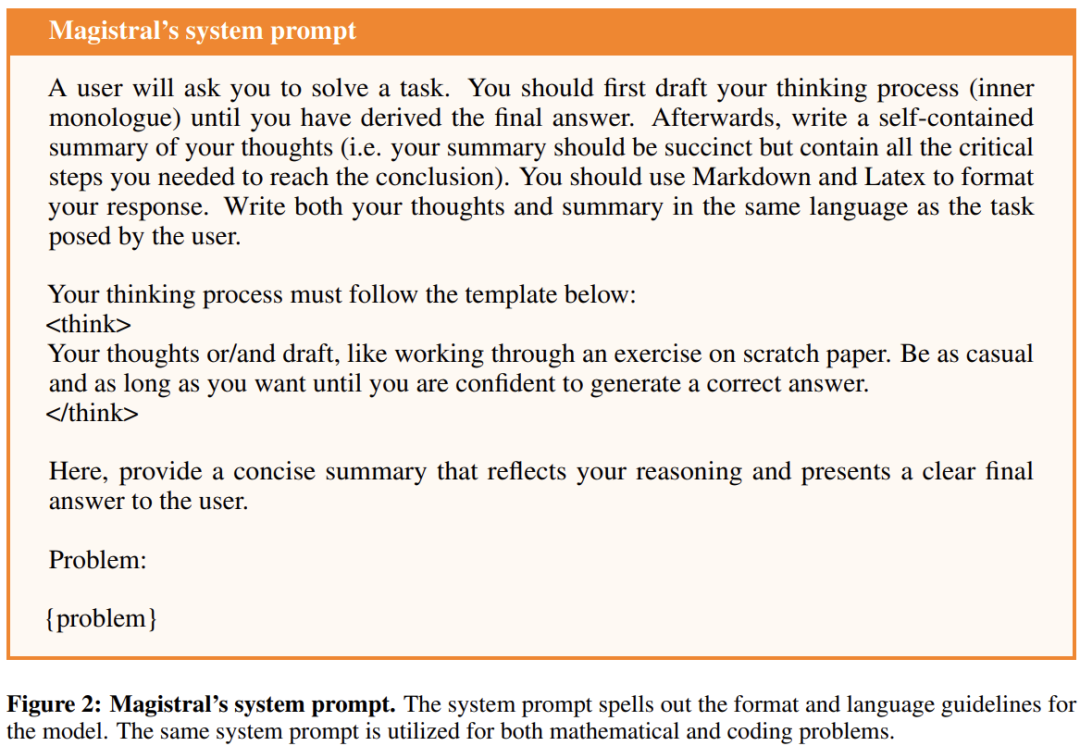 Mistral 进一步在系统提示中指定了格式和语言要求,如下图所示。实验发现强化学习训练对这些系统提示非常敏感。例如,系统提示中的「尽可能随意,尽可能长」部分增加了模型的熵,从而改善了模型的探索能力。